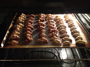 As you cut each triangle, roll it out from the wide end to the narrow and form a small crescent. You can place them close together on the ungreased pan as they only expand slightly in the baking process. Bake them approximately 12 minutes but check to see if they are slightly brown and crisp. Leave them in the oven a few minutes longer if necessary.