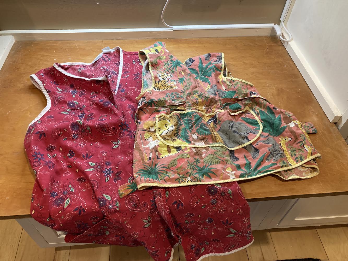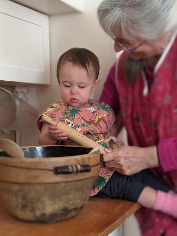 The smaller apron with animals on it is one that I remember wearing as a child. My maternal Grandma Kinsman may have made it for my sister Christy, the eldest child. I think that all four of us children must have worn that apron at one time or another. I have managed to keep it since we cleared out my parents house in 2006. Moving from one house to another, keeping it as we went, I did not fully believe that I would ever have a grandchild to wear it. I think my daughter probably wore it as well when she visited her Grandma in Elmira, and now my granddaughter can wear it as she learns to bake by my side.