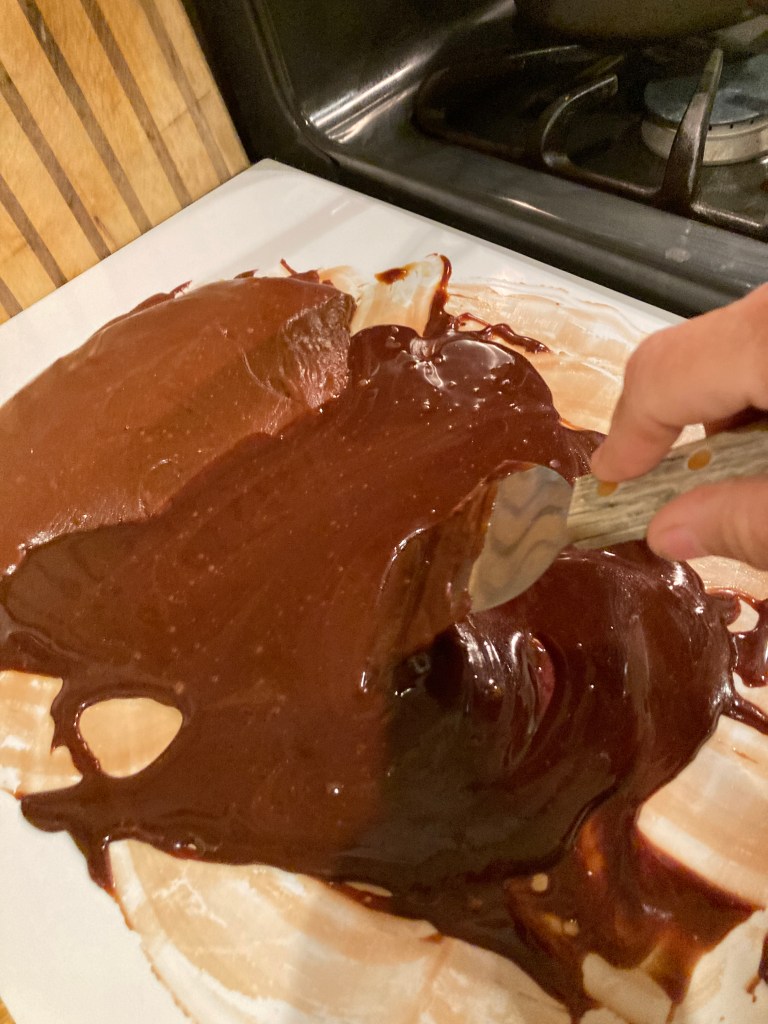 Pour onto marble surface (I used a 40 year old Corning ware counter saver) and beat. I interpreted this by using a metal spatula and moving the fudge around on it to cool it. This is where I was not sure exactly how to proceed so I “beat” is on the counter saver which cooled it quickly but then before it set up I poured it into a cake pan. I think I should have let is cool completely on the counter saver and then just cut it in pieces from there. The gravestone was certainly not large enough to add all those details so I improvised!