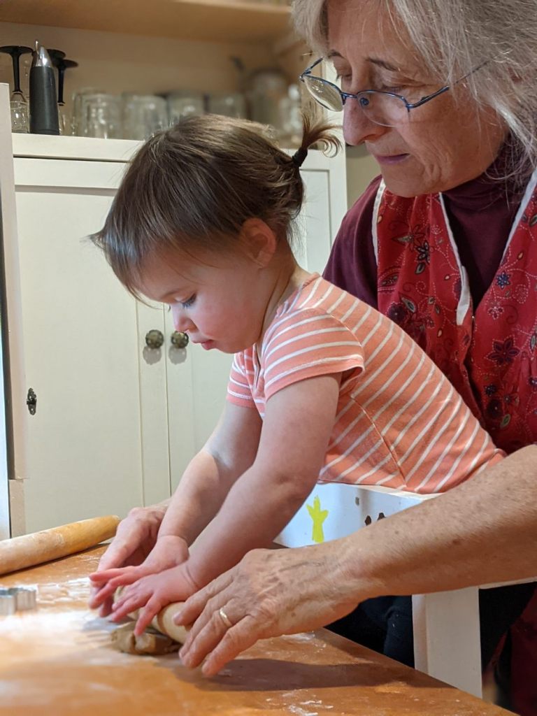 This year was a special year. I introduced our 22 month old granddaughter Pippa to the process. She loves play dough. This was her first time with real dough. Surprisingly, she did not try to eat the dough. Good thing, since her mom and I like to eat the dough. We didn’t want to compete with her. And, yes, we know we aren’t supposed to eat raw dough but we both have done that since we were children and we have lived to tell about it. Just don’t ask us to share our raw dough with you!